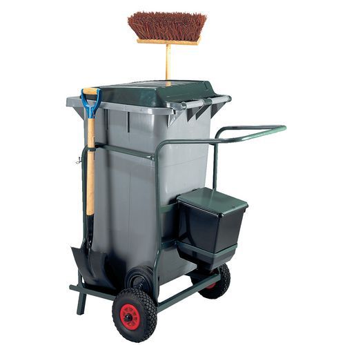 - Robust vogn, bruges udendørs. Komplet med en 240 l. tønde og en spand, 2 hjul, spade og kost.